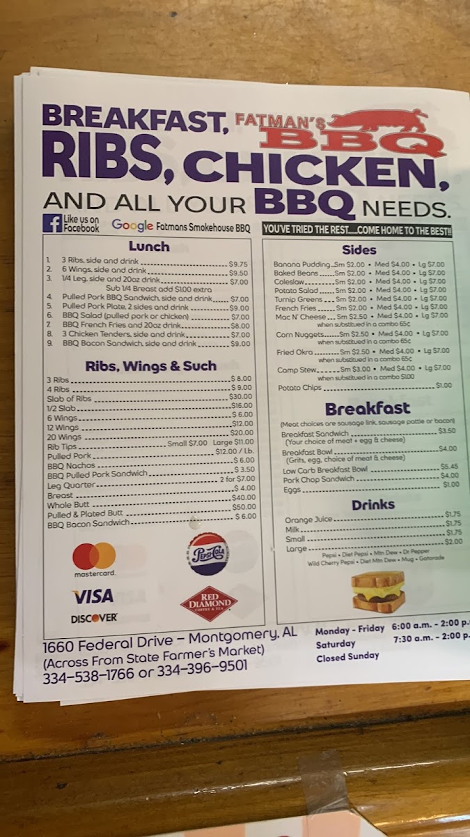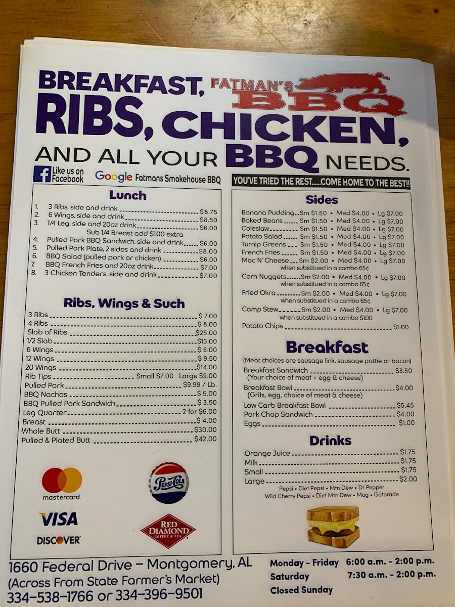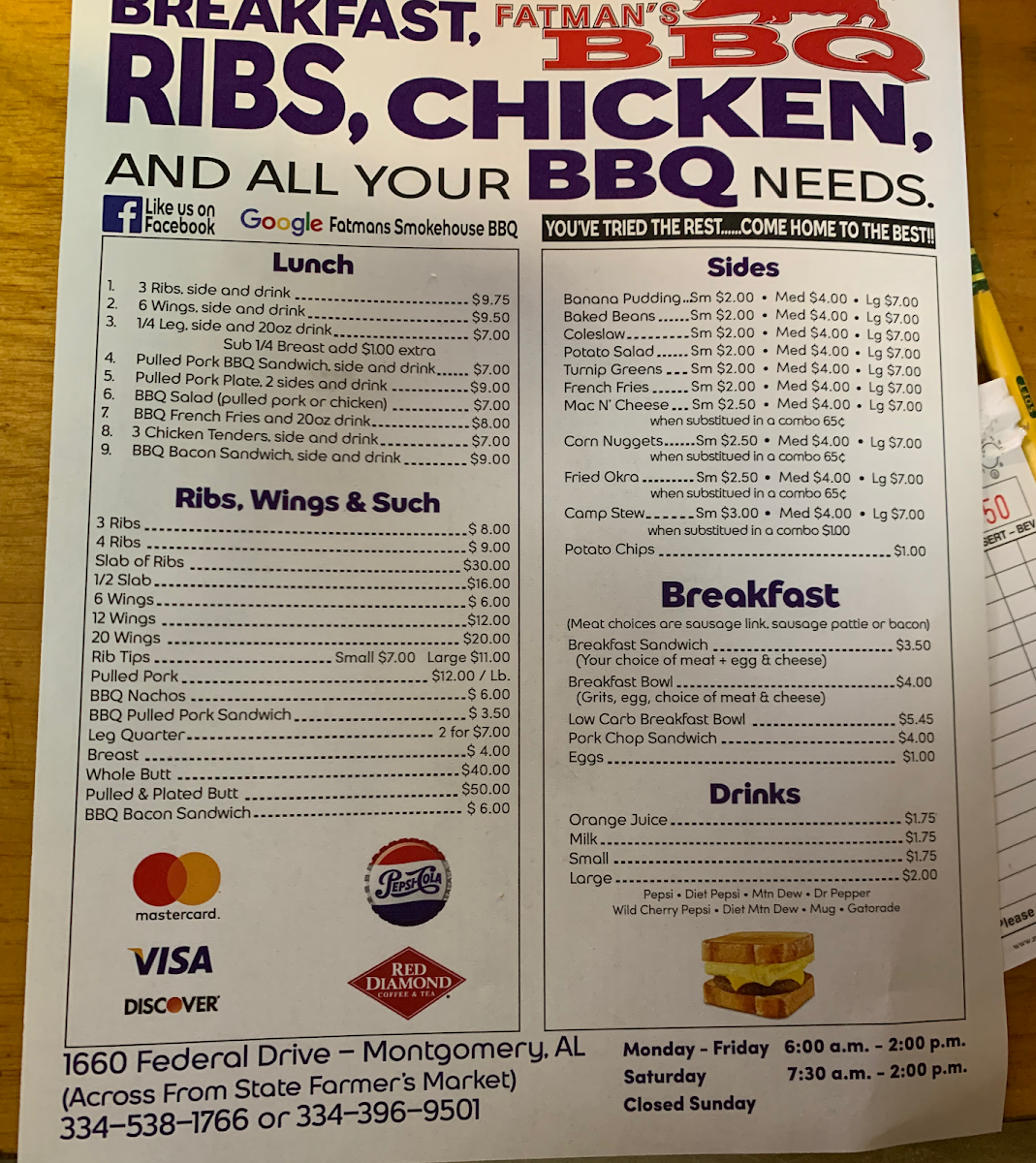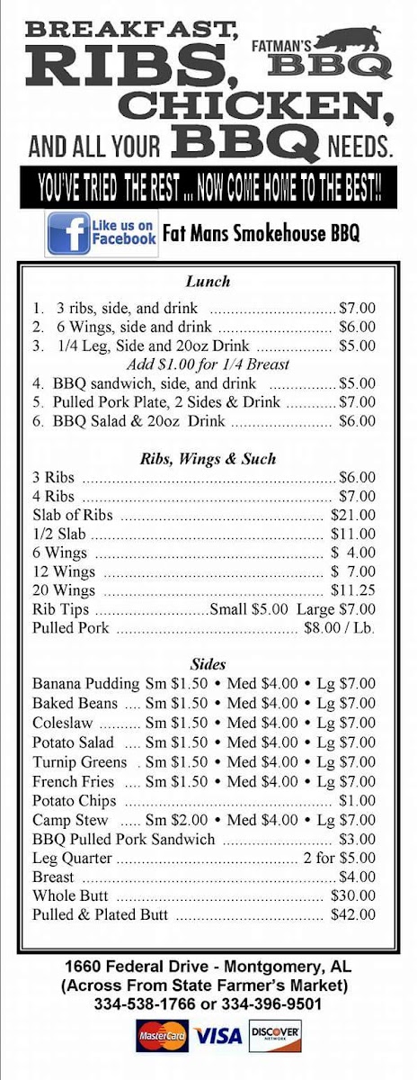 Fat Man's Smokehouse BBQ offers a straightforward, comforting menu that blends classic barbecue favorites with hearty breakfast options. Whether you're stopping by for a relaxed lunch or enjoying a casual morning meal, the menu suits those looking for generous, flavorful dishes in an unpretentious setting.