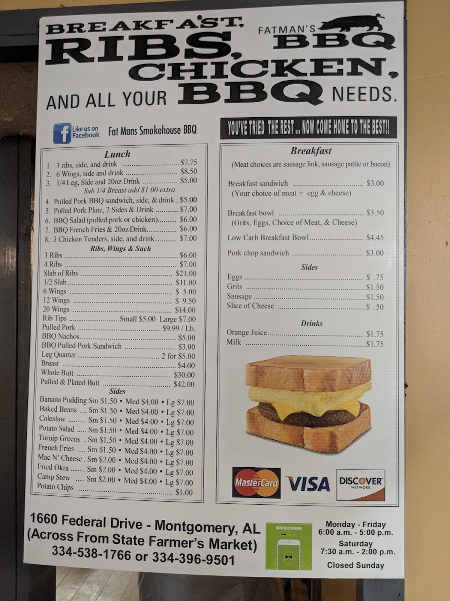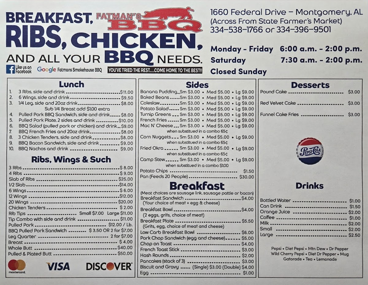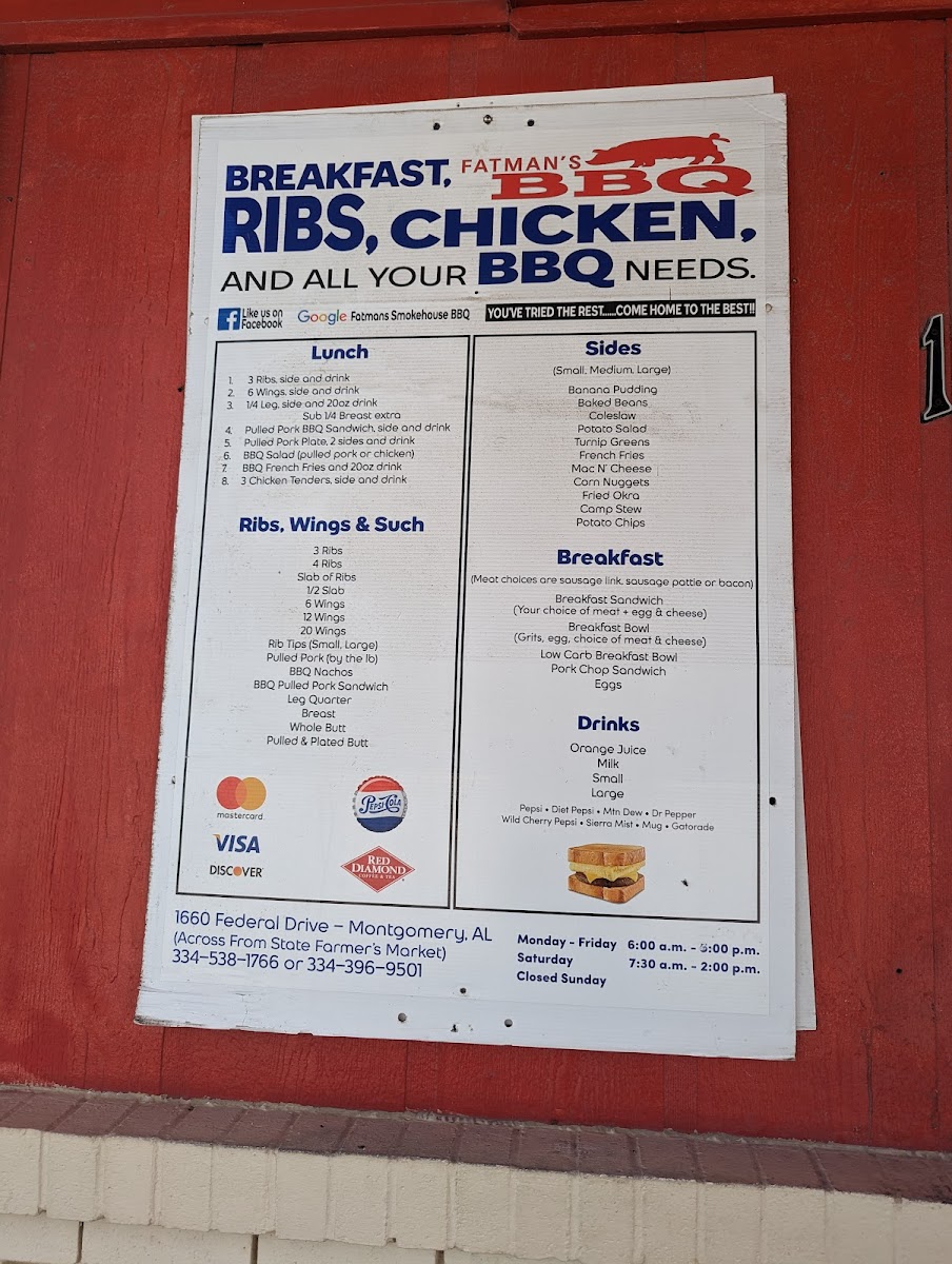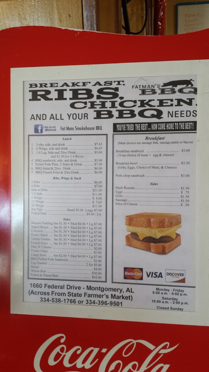 Fat Man's Smokehouse BBQ offers a straightforward, comforting menu that blends classic barbecue favorites with hearty breakfast options. Whether you're stopping by for a relaxed lunch or enjoying a casual morning meal, the menu suits those looking for generous, flavorful dishes in an unpretentious setting.